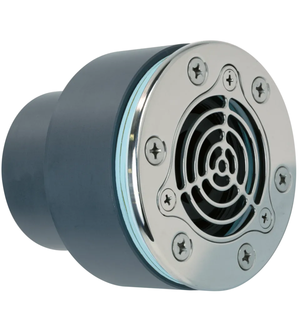Bocchetta a parete con flangia e griglia inox AISI316L e corpo in PVC con attacco F ø50 o M ø75 mm